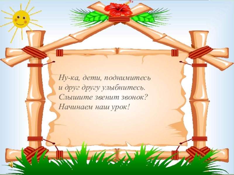 Слайд 2 Ну-ка, дети, поднимитесь и друг другу улыбнитесь. Слышите звенит звонок? Начинаем наш урок!