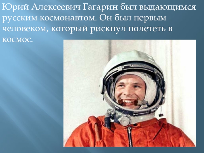 Юрий Алексеевич Гагарин был выдающимся русским космонавтом. Он был первым человеком, который рискнул полететь в космос.