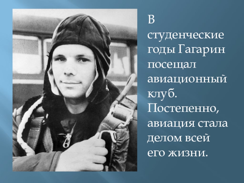 Слайд 6В студенческие годы Гагарин посещал авиационный клуб. Постепенно, авиация стала делом