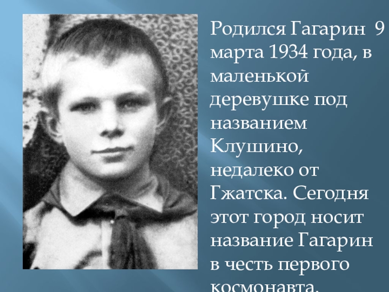 Родился Гагарин 9 марта 1934 года, в маленькой деревушке под названием Клушино, недалеко от Гжатска. Сегодня этот