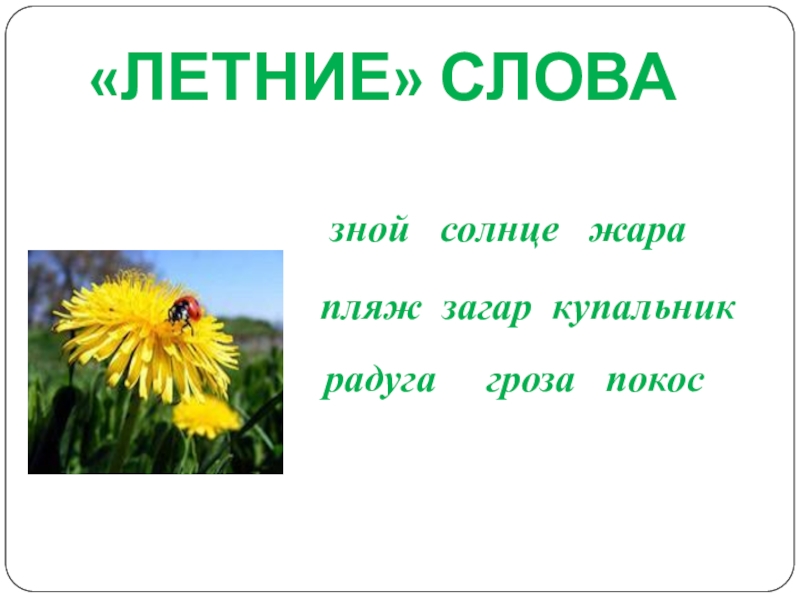 «ЛЕТНИЕ» СЛОВА  зной  солнце  жара  пляж загар купальник радуга   гроза