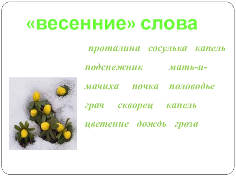 «весенние» слова   проталина  сосулька  капель  подснежник     мать-и-мачиха