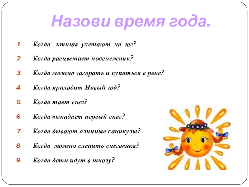 Назови время года.Когда  птицы улетают на юг?Когда расцветает подснежник?Когда можно загорать и купаться в реке?Когда приходит