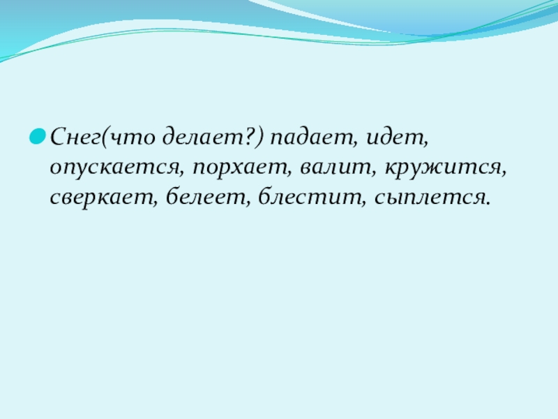 Слайд 10Снег(что делает?) падает, идет, опускается, порхает, валит, кружится, сверкает, белеет, блестит,