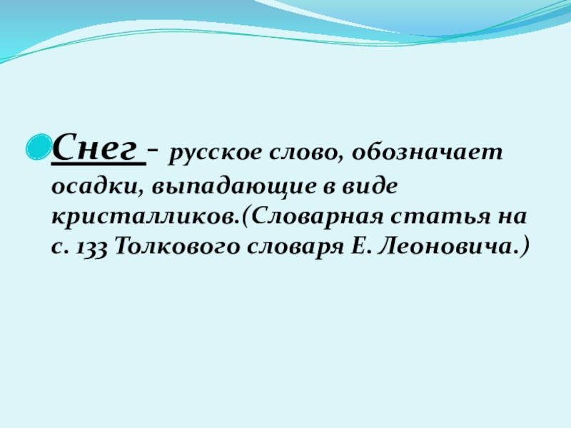 Слайд 4Снег - русское слово, обозначает осадки, выпадающие в виде кристалликов.(Словарная статья
