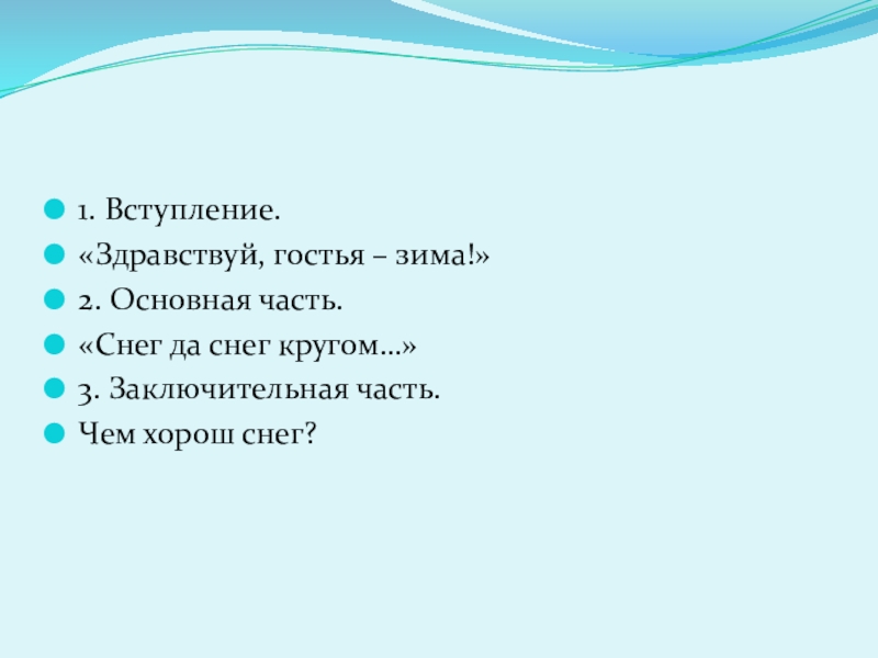 1. Вступление.«Здравствуй, гостья – зима!»2. Основная часть.«Снег да снег кругом…»3. Заключительная часть.Чем хорош снег?