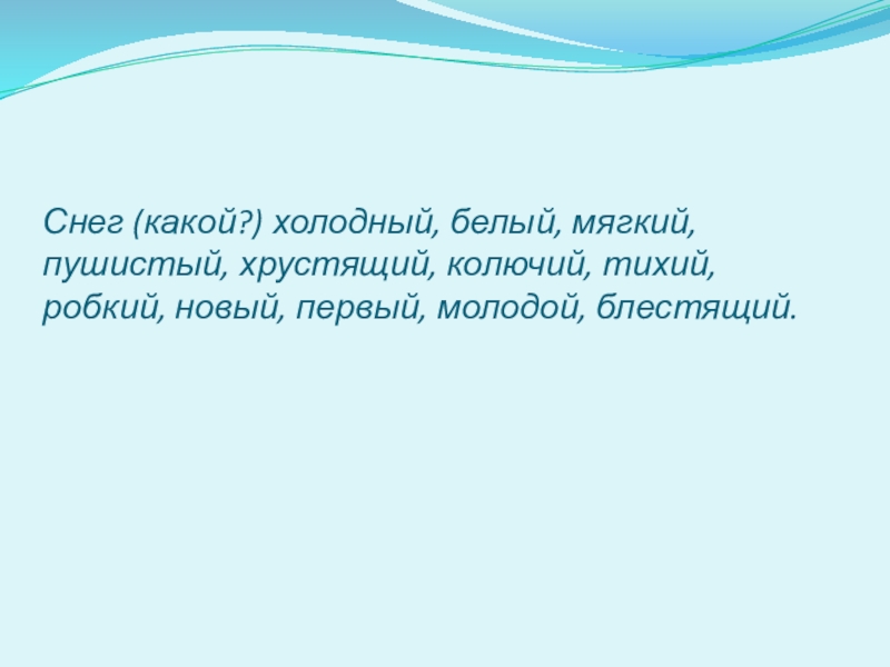 Слайд 8Снег (какой?) холодный, белый, мягкий, пушистый, хрустящий, колючий, тихий, робкий, новый,