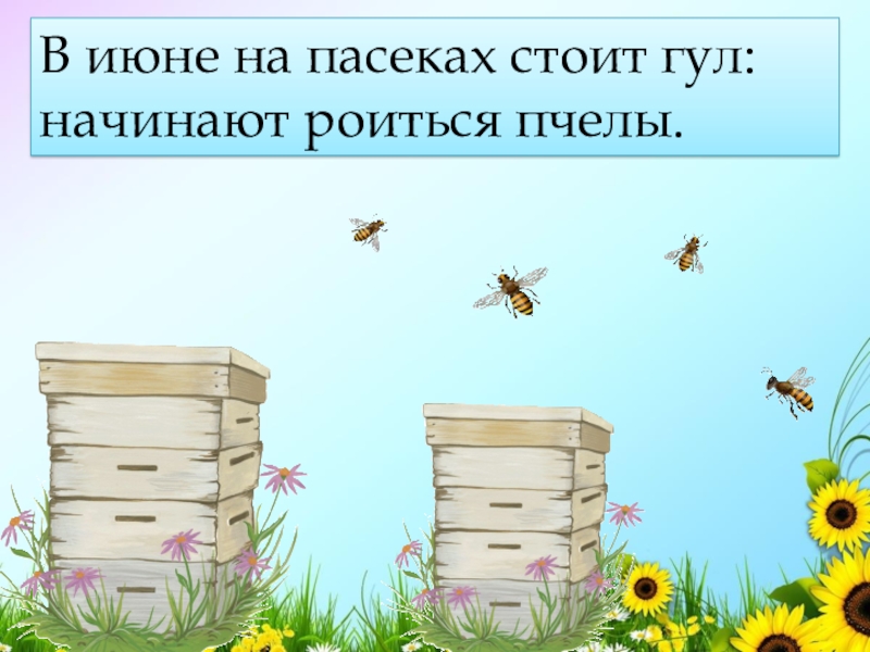 Слайд 15В июне на пасеках стоит гул: начинают роиться пчелы.