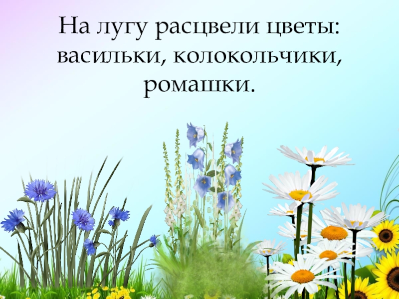 На лугу расцвели цветы:  васильки, колокольчики, ромашки.