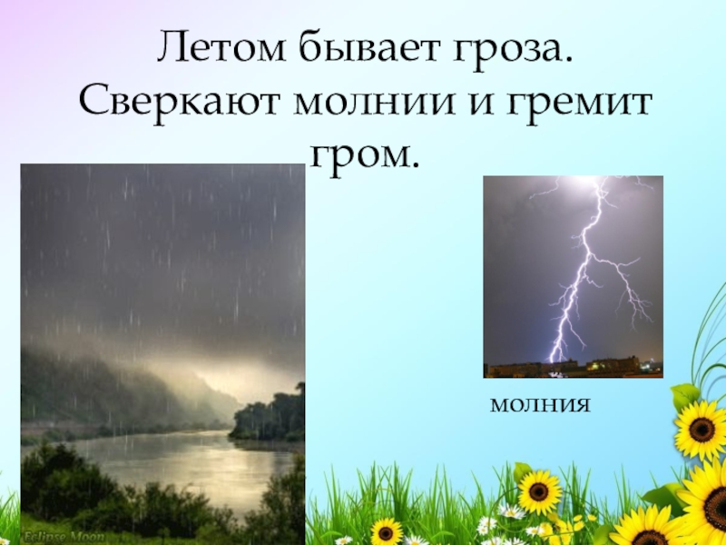 Летом бывает гроза. Сверкают молнии и гремит гром.молния