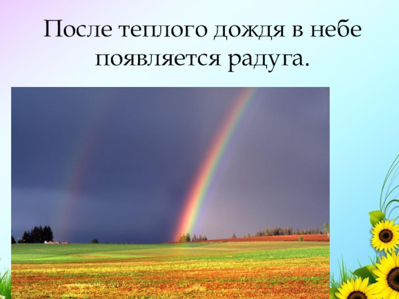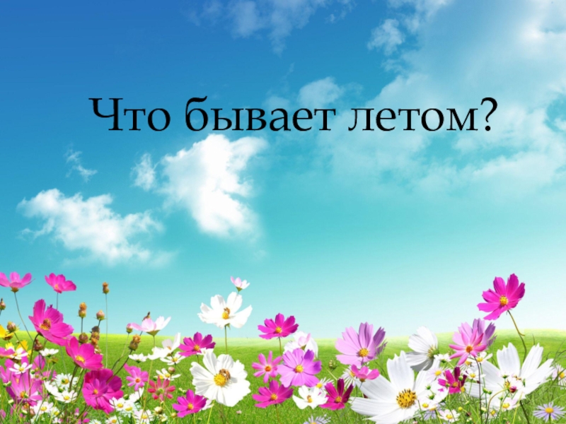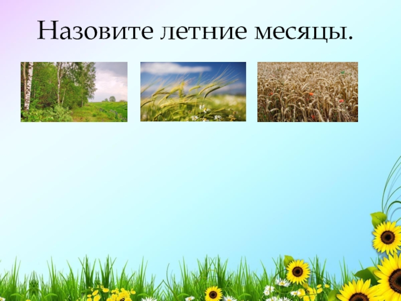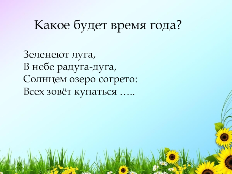 Какое будет время года?Зеленеют луга,В небе радуга-дуга,Солнцем озеро согрето:Всех зовёт купаться …..лето