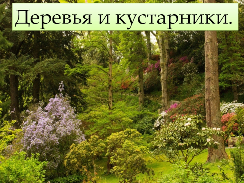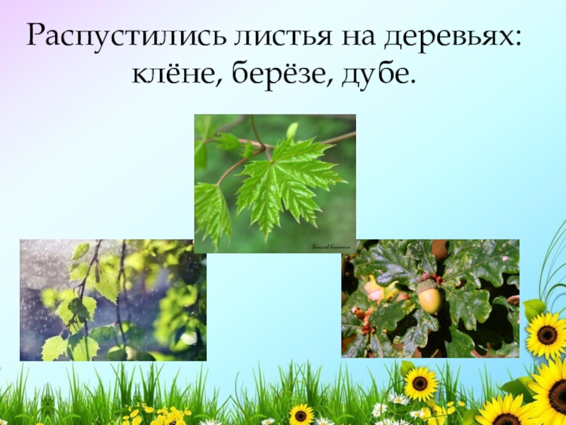 Слайд 10Распустились листья на деревьях: клёне, берёзе, дубе.