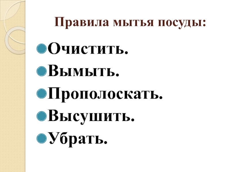 Правила мытья посуды:Очистить.Вымыть.Прополоскать.Высушить.Убрать.