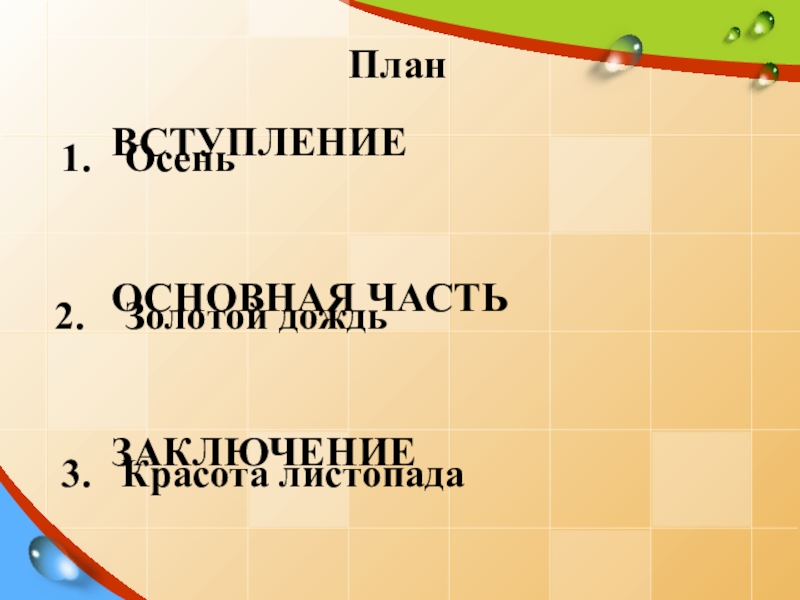 ПланВСТУПЛЕНИЕОСНОВНАЯ ЧАСТЬЗАКЛЮЧЕНИЕОсеньЗолотой дождьКрасота листопада1.2.3.