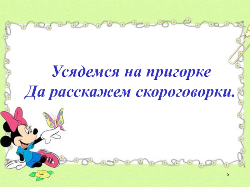 Слайд 6Усядемся на пригорке Да расскажем скороговорки.