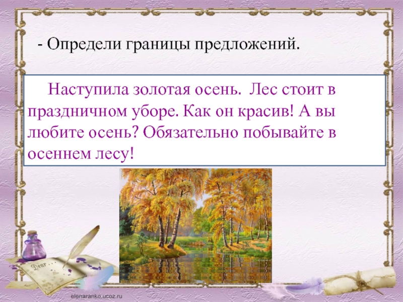 Наступила золотая осень. Лес стоит в праздничном уборе. Как он красив! А вы любите осень? Обязательно побывайте в осеннем лесу!