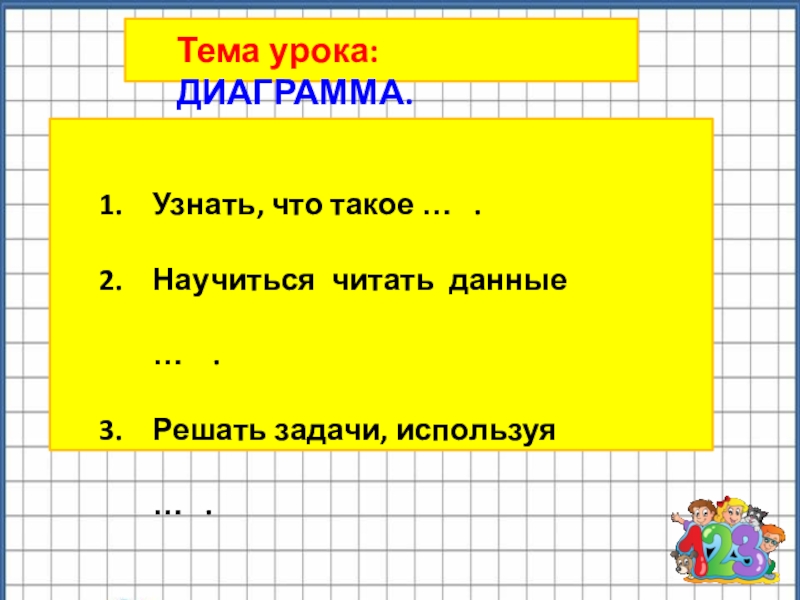 Тема урока: ДИАГРАММА.Узнать, что такое …  .Научиться читать данные …  .Решать задачи, используя …