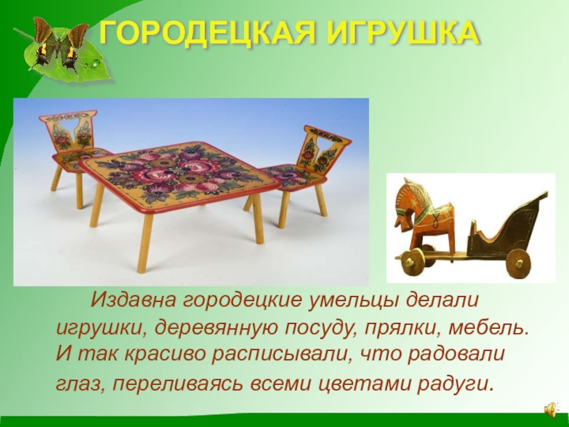 ГОРОДЕЦКАЯ ИГРУШКА    Издавна городецкие умельцы делали игрушки, деревянную посуду, прялки, мебель. И так красиво