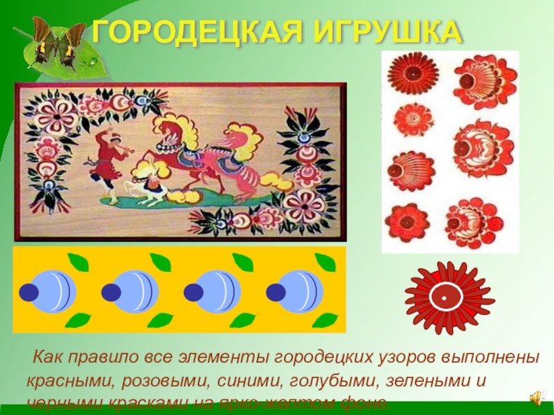 ГОРОДЕЦКАЯ ИГРУШКА  Как правило все элементы городецких узоров выполнены красными, розовыми, синими, голубыми, зелеными и черными