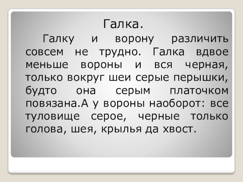 3)Галка вдвое меньше вороны и вся черная, только вокруг шеи серые перышки, будто она серым платочком повязана.