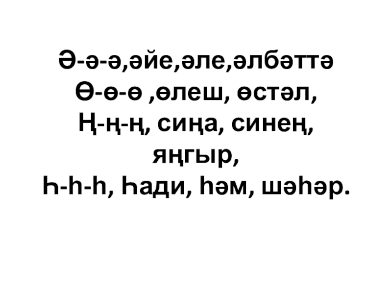Слайд 1Ә-ә-ә,әйе,әле,әлбәттә Ө-ө-ө ,өлеш, өстәл, Ң-ң-ң, сиңа, синең, яңгыр, Һ-һ-һ, Һади, һәм, шәһәр.