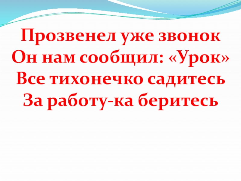 Прозвенел уже звонок Он нам сообщил: «Урок»Все тихонечко садитесь За работу-ка беритесь