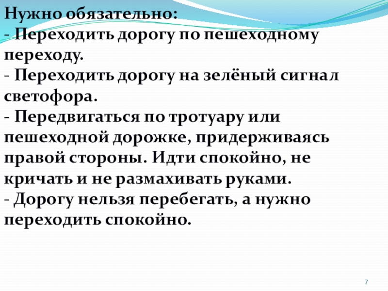 Нужно обязательно:- Переходить дорогу по пешеходному переходу.- Переходить дорогу на зелёный сигнал светофора.- Передвигаться по тротуару или