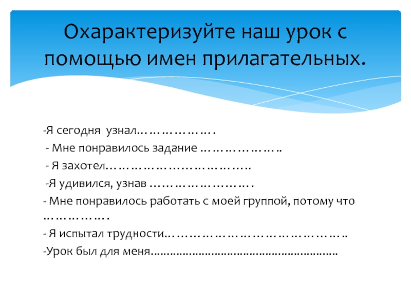 Охарактеризуйте наш урок с помощью имен прилагательных.