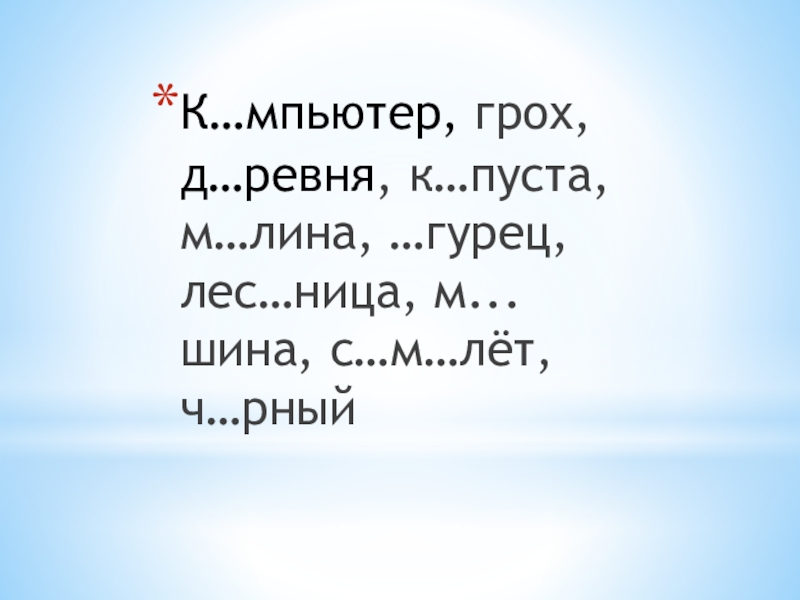 Слайд 14К…мпьютер, грох, д…ревня, к…пуста, м…лина, …гурец, лес…ница, м...шина, с…м…лёт, ч…рный