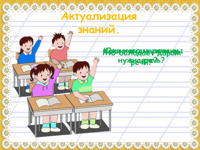 Актуализация знаний.Кто обладает даром речи?Для чего человеку нужна речь?Какие виды речи вы знаете?