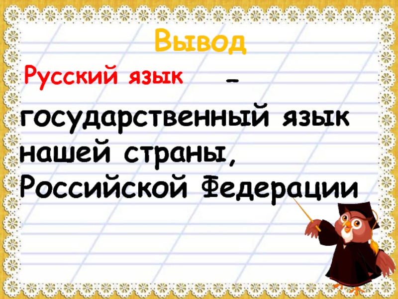 ВыводРусский язык        – государственный язык нашей страны, Российской Федерации