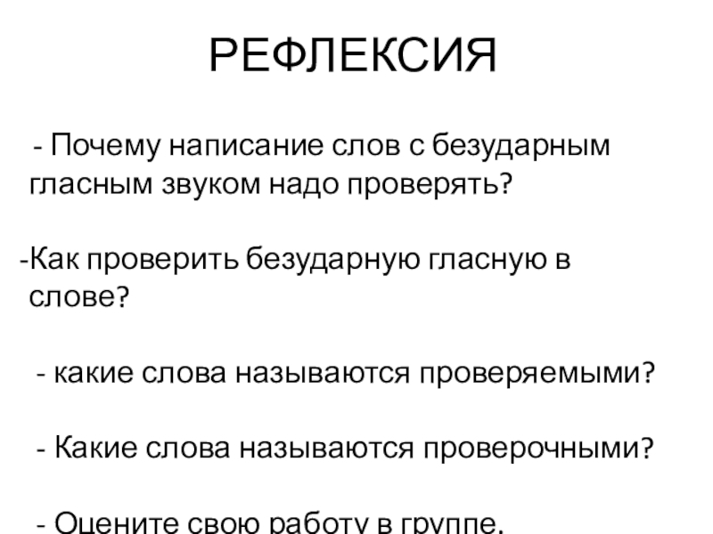 РЕФЛЕКСИЯ - Почему написание слов с безударным   гласным звуком надо проверять?Как проверить безударную гласную в