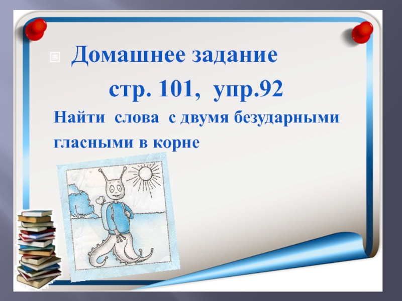 Домашнее задание     стр. 101, упр.92Найти слова с двумя безударными гласными в корне
