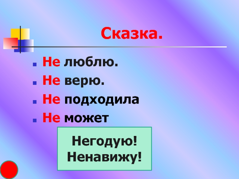 Сказка.Не люблю.Не верю.Не подходилаНе можетНегодую!Ненавижу!