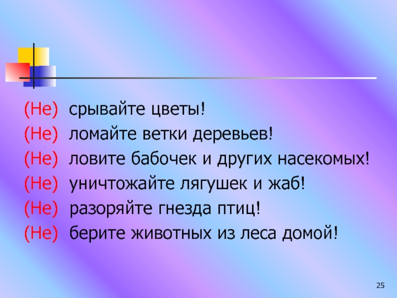 (Не) срывайте цветы!(Не) ломайте ветки деревьев!(Не) ловите бабочек и других насекомых!(Не) уничтожайте лягушек и жаб!(Не) разоряйте гнезда