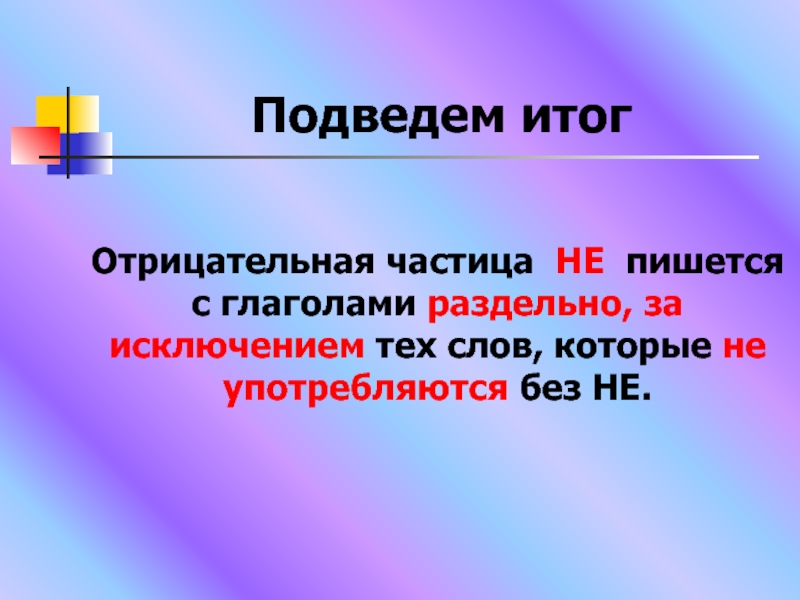 Подведем итогОтрицательная частица НЕ пишется с глаголами раздельно, за исключением тех слов, которые не употребляются без НЕ.
