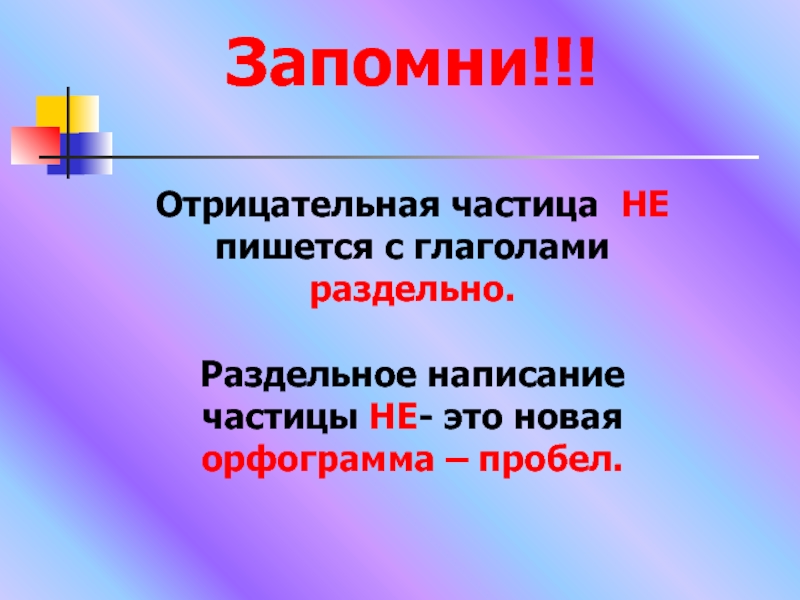 Запомни!!!Отрицательная частица НЕ пишется с глаголами раздельно.Раздельное написание частицы НЕ- это новая орфограмма – пробел.