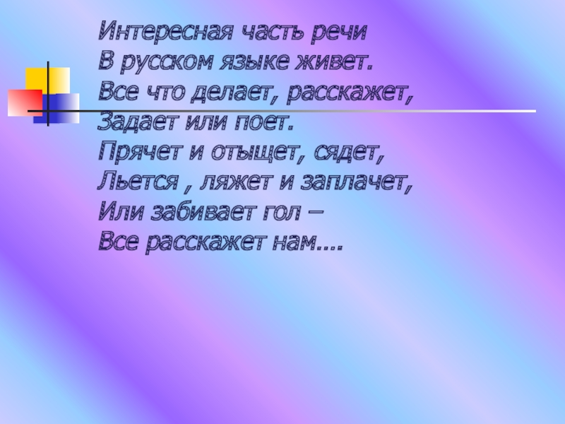 Слайд 4Интересная часть речи  В русском языке живет.  Все что делает, расскажет,  Задает или поет.  Прячет