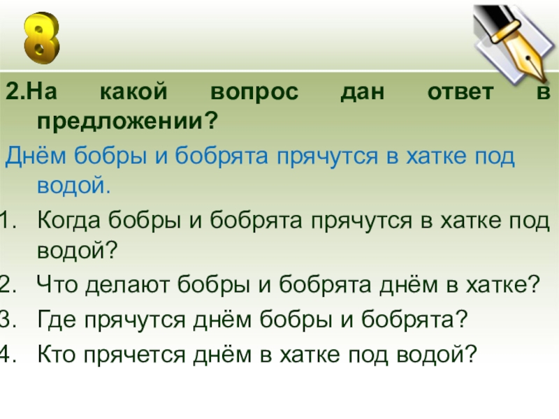 2.На какой вопрос дан ответ в предложении?Днём бобры и бобрята прячутся в хатке под водой.Когда бобры и