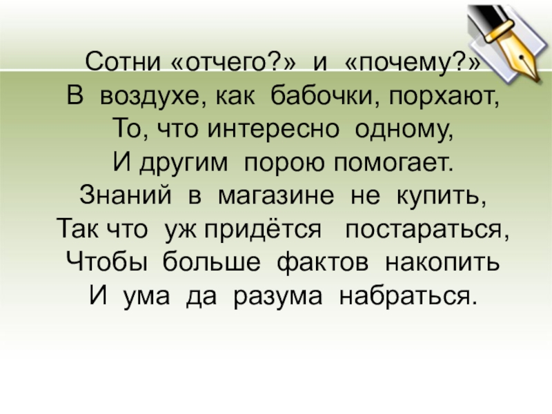 Слайд 11Сотни «отчего?» и «почему?» В воздухе, как бабочки, порхают, То, что интересно одному, И