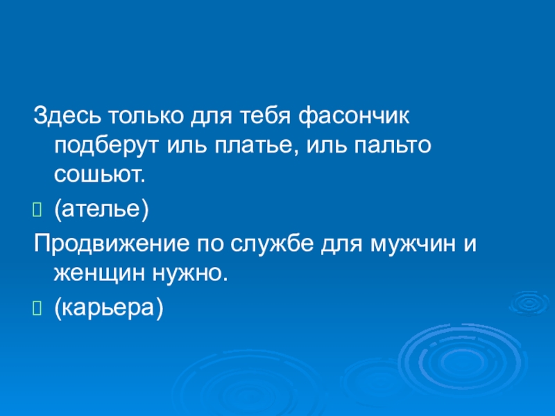 Здесь только для тебя фасончик подберут иль платье, иль пальто сошьют.(ателье)Продвижение по службе для мужчин и женщин
