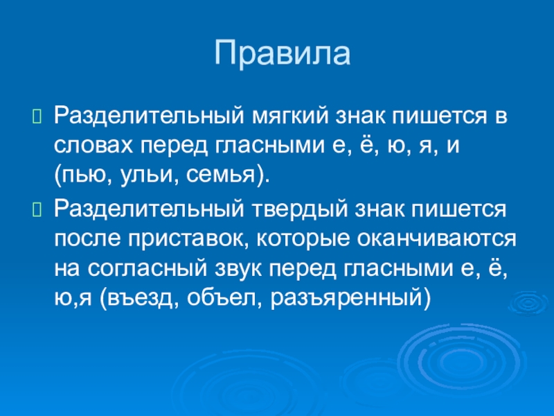 ПравилаРазделительный мягкий знак пишется в словах перед гласными е, ё, ю, я, и (пью, ульи, семья).Разделительный твердый