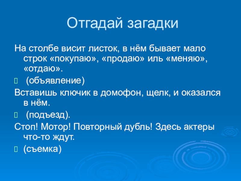 Отгадай загадкиНа столбе висит листок, в нём бывает мало строк «покупаю», «продаю» иль «меняю», «отдаю». (объявление)Вставишь ключик