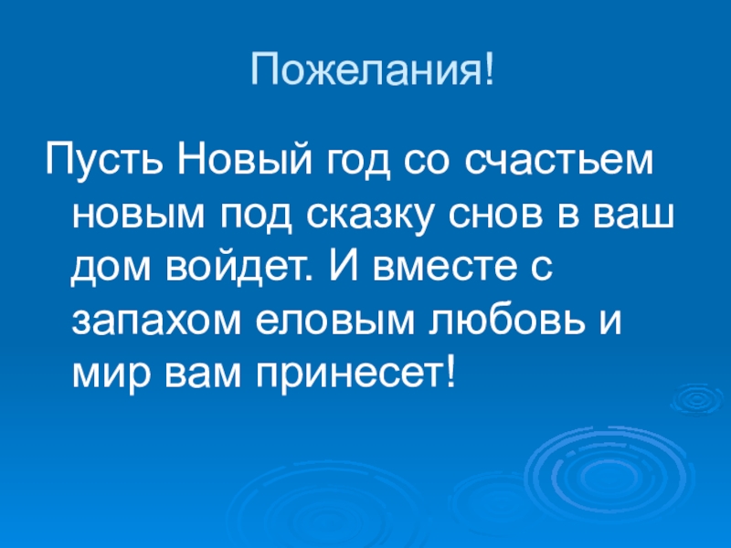 Пожелания!Пусть Новый год со счастьем новым под сказку снов в ваш дом войдет. И вместе с запахом
