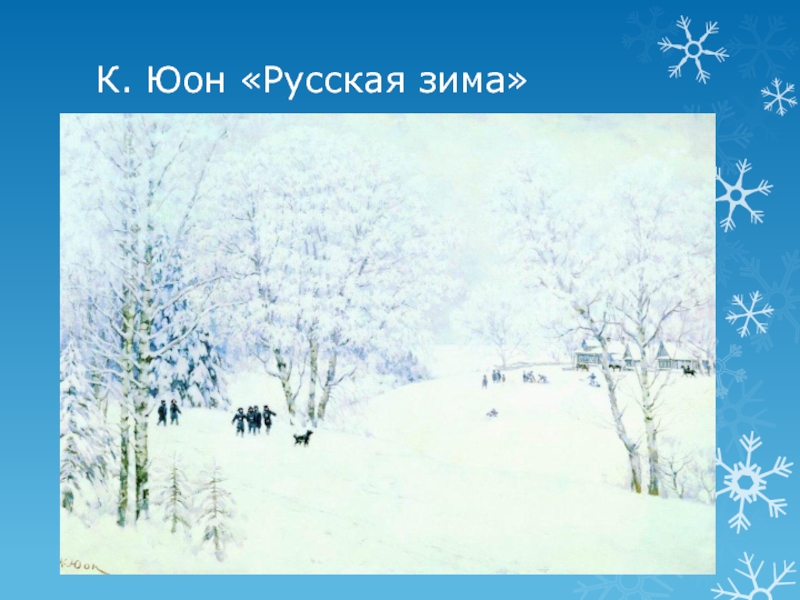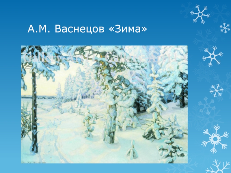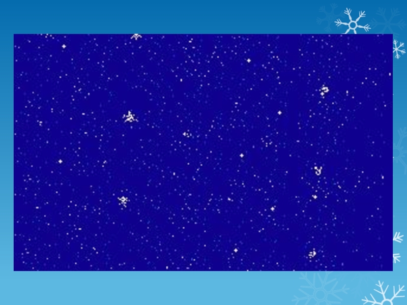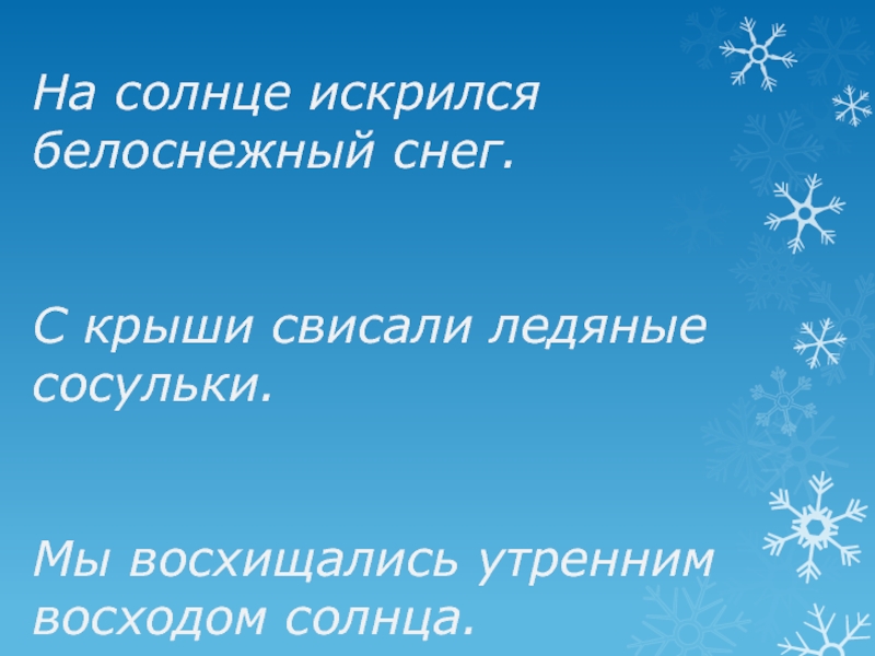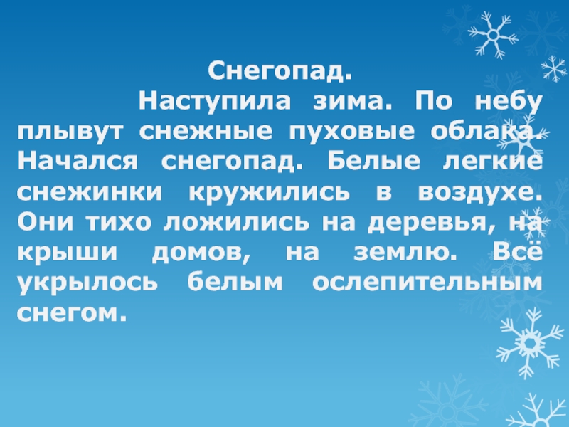 Начался снегопад. Белые кружевные снежинки кружились в воздухе. Снежинки тихо ложились на деревья на крыши домов на землю. Всё укрылось белым ослепительным снегом.