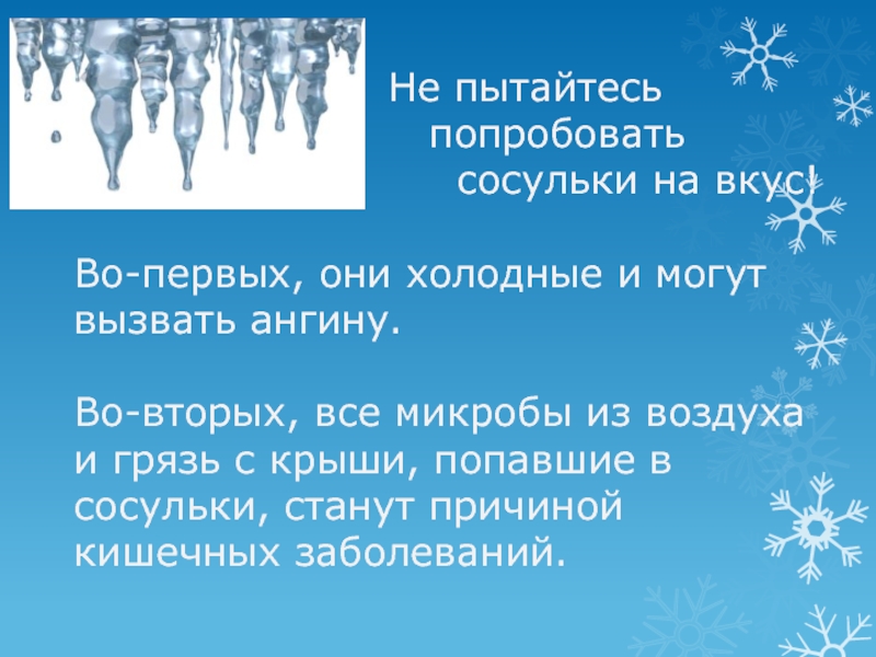 Во-вторых, все микробы из воздуха и грязь с крыши, попавшие в сосульки, станут причиной кишечных заболеваний.