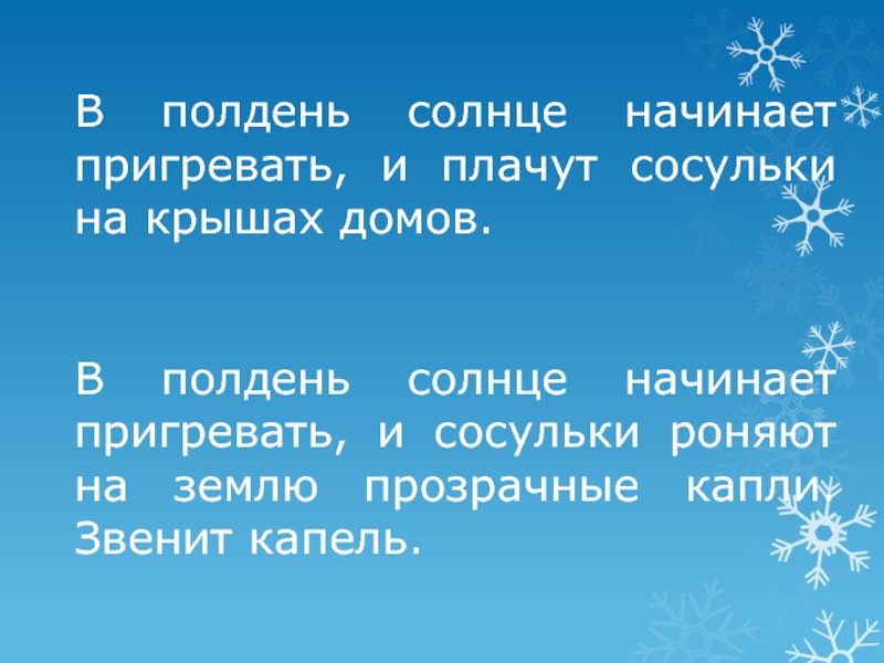 В полдень солнце начинает пригревать, и сосульки роняют на землю прозрачные капли. Звенит капель.