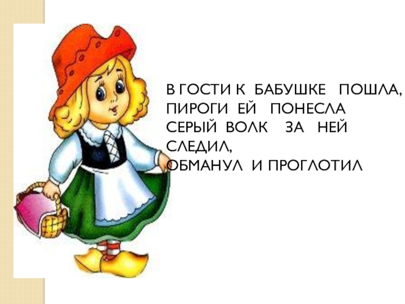В ГОСТИ К БАБУШКЕ  ПОШЛА,ПИРОГИ ЕЙ  ПОНЕСЛАСЕРЫЙ ВОЛК  ЗА  НЕЙ  СЛЕДИЛ,ОБМАНУЛ И