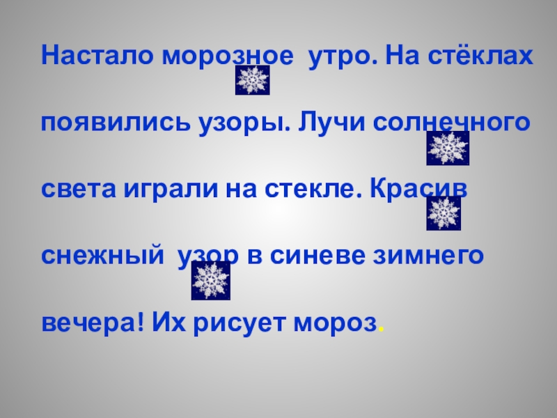 Слайд 4Настало морозное утро. На стёклах появились узоры. Лучи солнечного света играли