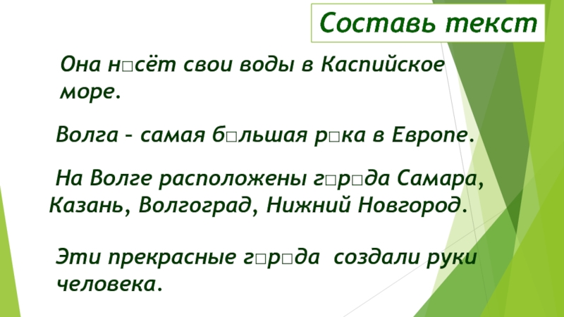На Волге расположены г□р□да Самара, Казань, Волгоград, Нижний Новгород.